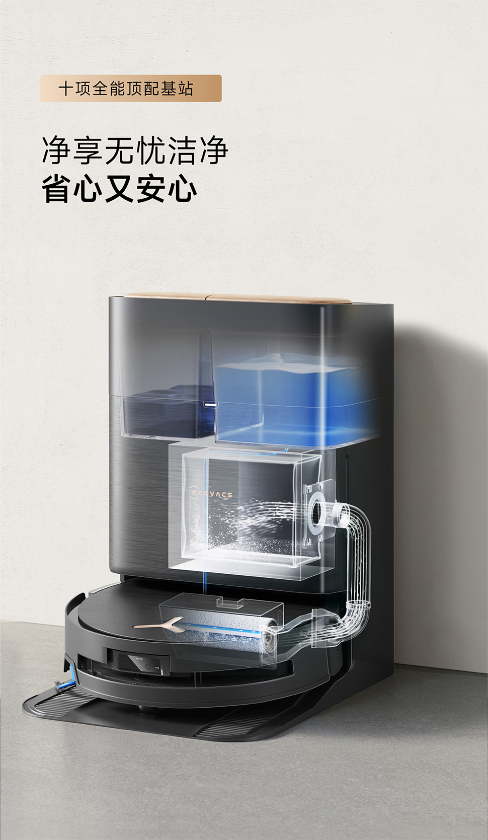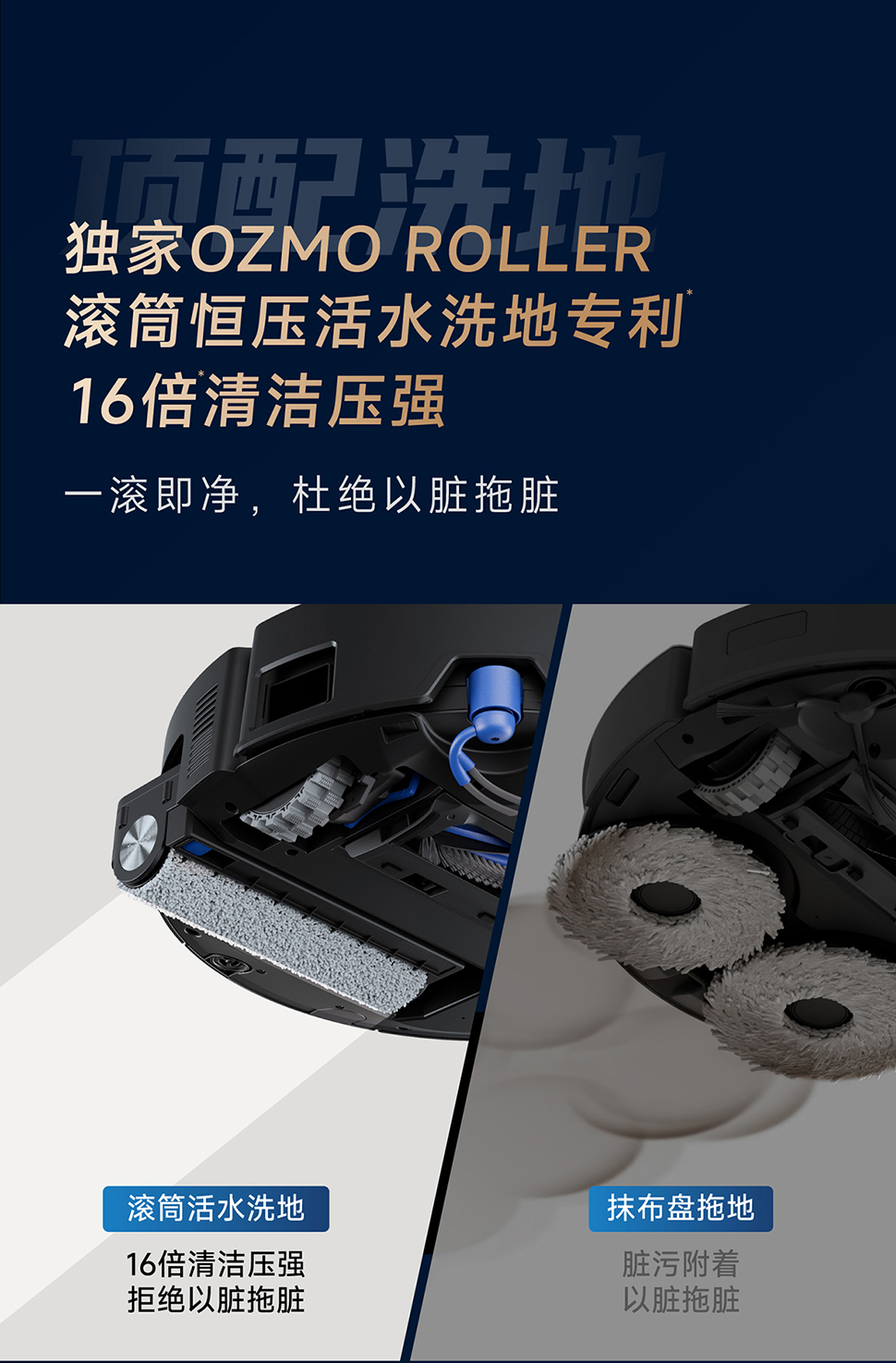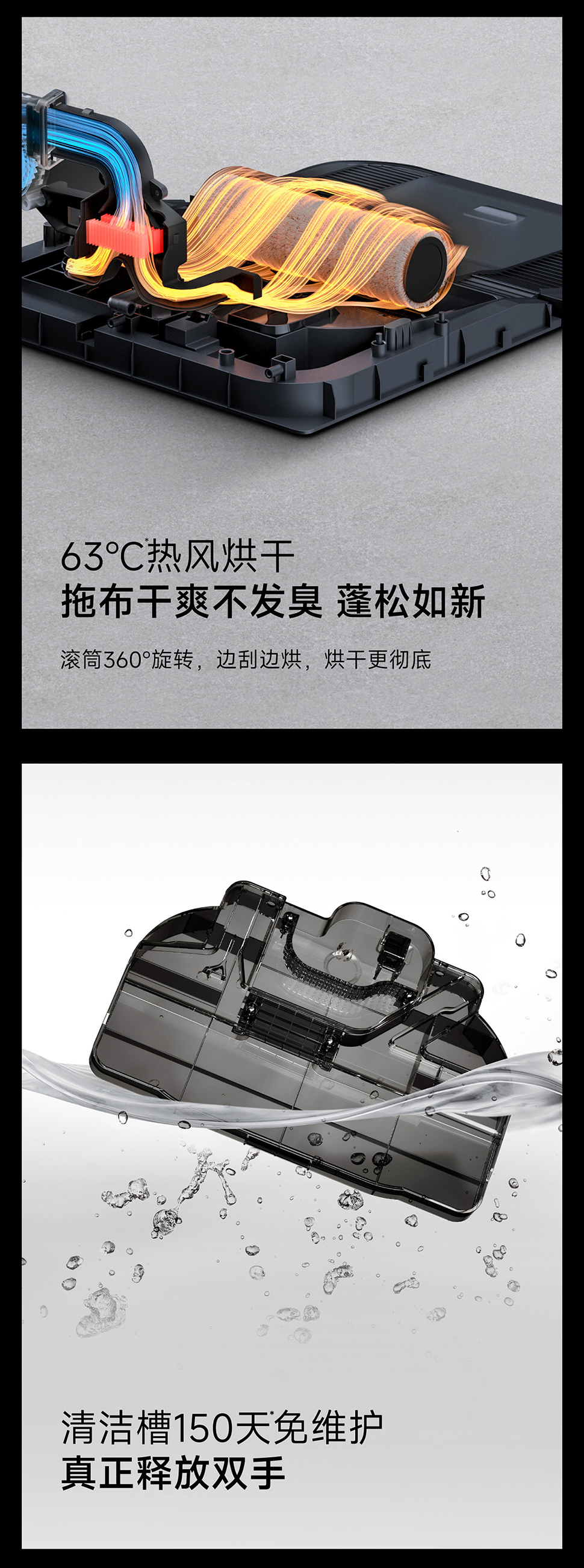 包装清单 | 主机*1、基站*1、电源线*1、说明书*1、快速指南*1、边刷*1、毛胶滚刷&滚刷盖板(个)*1、抗菌滤芯*1、抗菌集尘袋*1、清洁消毒剂(260ml/瓶)*1、普通滚筒(灰色)*1,清水箱(个)*1、污水箱(个)*1 |