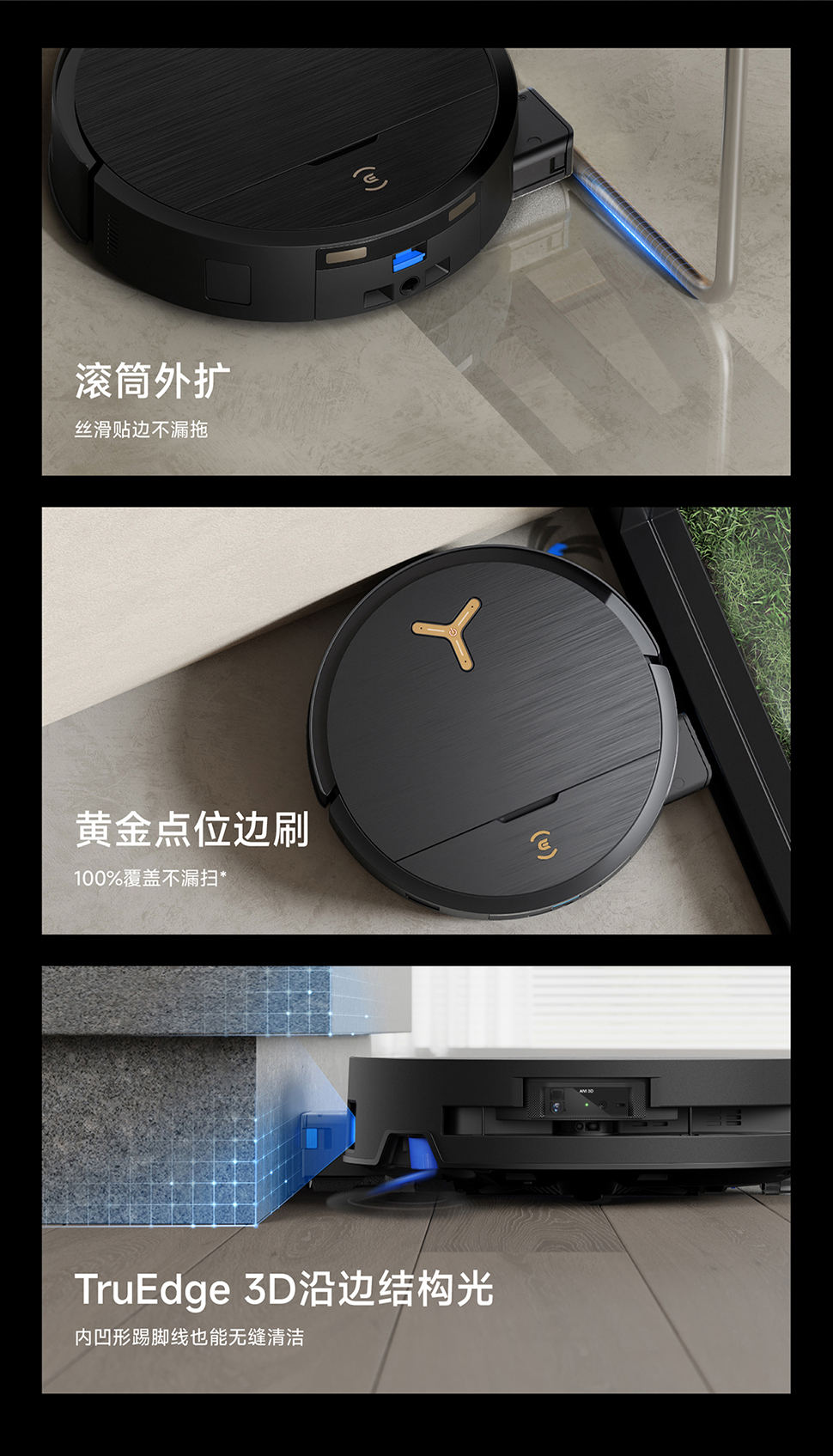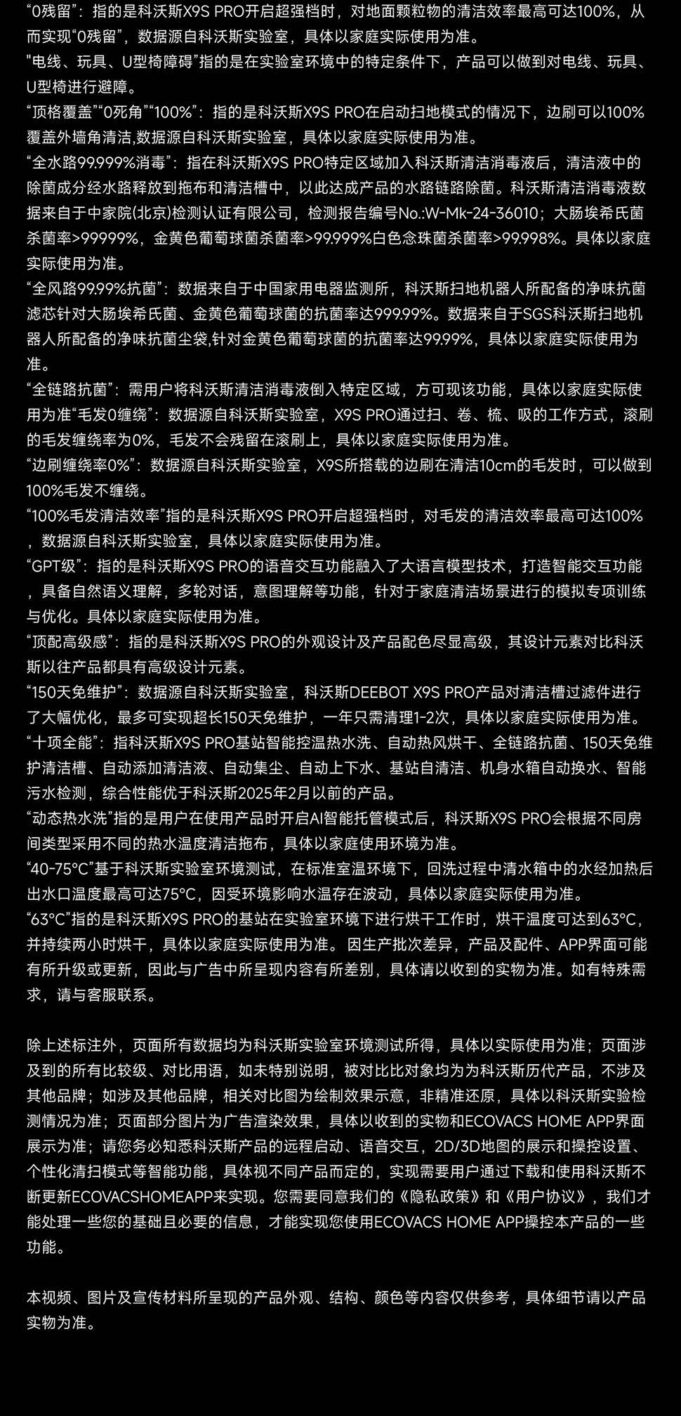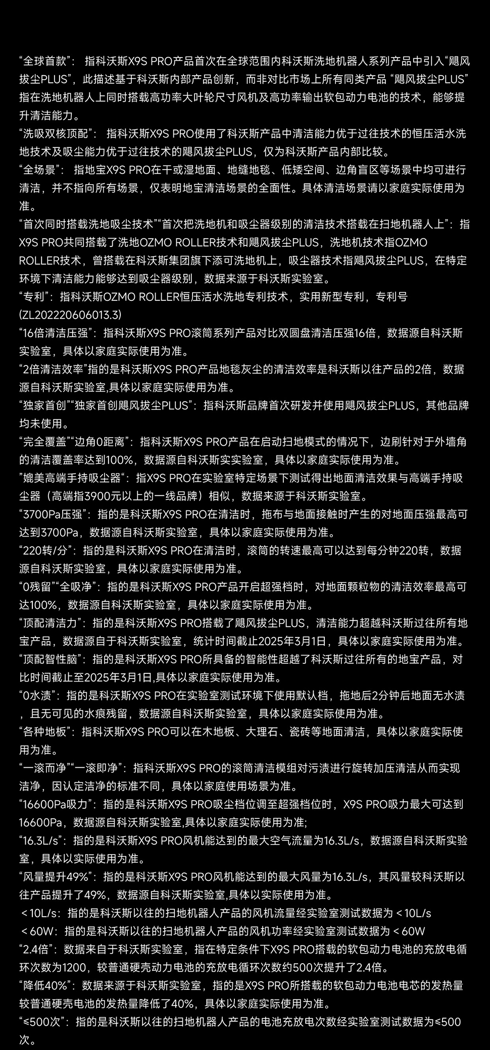 包装清单 | 主机*1、基站*1、电源线*1、说明书*1、快速指南*1、边刷*1、毛胶滚刷&滚刷盖板(个)*1、抗菌滤芯*1、抗菌集尘袋*1、清洁消毒剂(260ml/瓶)*1、普通滚筒(灰色)*1,清水箱(个)*1、污水箱(个)*1 |