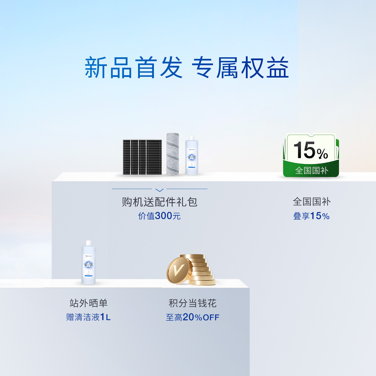 包装清单 | 主机*1、基站*1、电源线*1、说明书*1、快速指南*1、边刷(个)*1、毛胶滚刷&滚刷盖板(个)*1、抗菌滤芯(个)*1、抗菌尘袋(个)*1、清洁消毒剂(260ml/瓶)*1、普通尼龙滚筒(个)*1、清水箱(个)*1、污水箱(个)*1 |