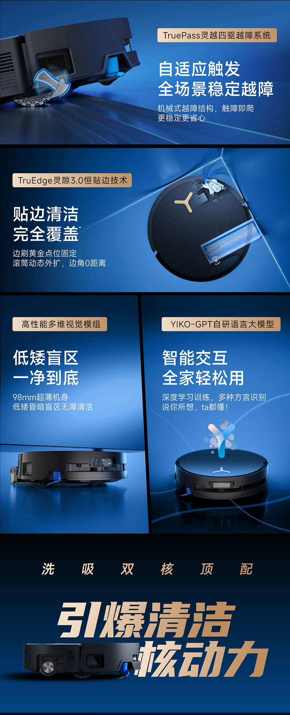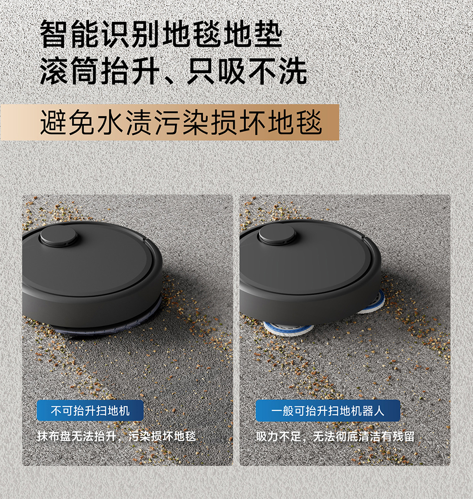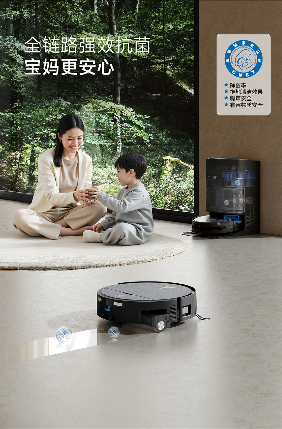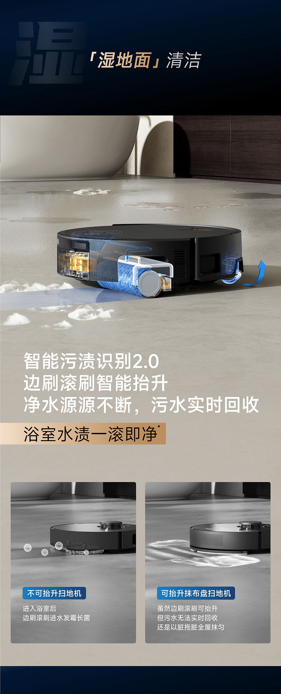 包装清单 | 主机*1、基站*1、电源线*1、说明书*1、快速指南*1、边刷*1、毛胶滚刷&滚刷盖板(个)*1、抗菌滤芯*1、抗菌集尘袋*1、清洁消毒剂(260ml/瓶)*1,普通滚筒(灰色)*1,上下水模块(含配件)*1 |