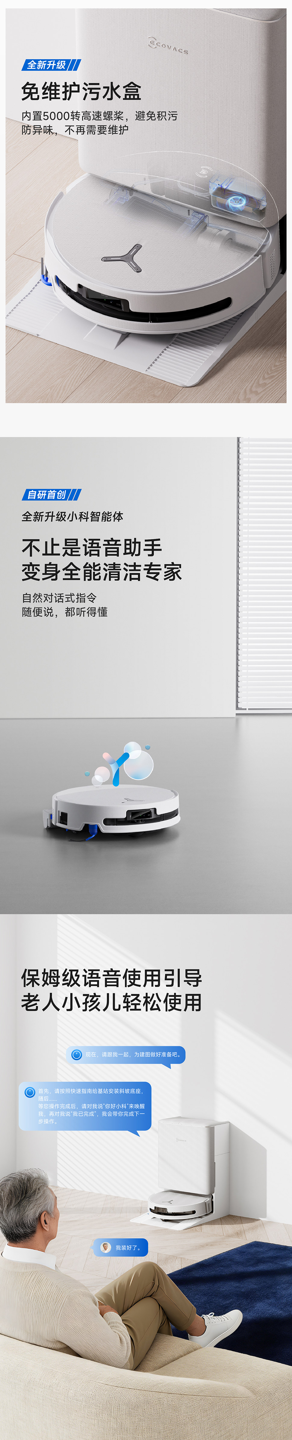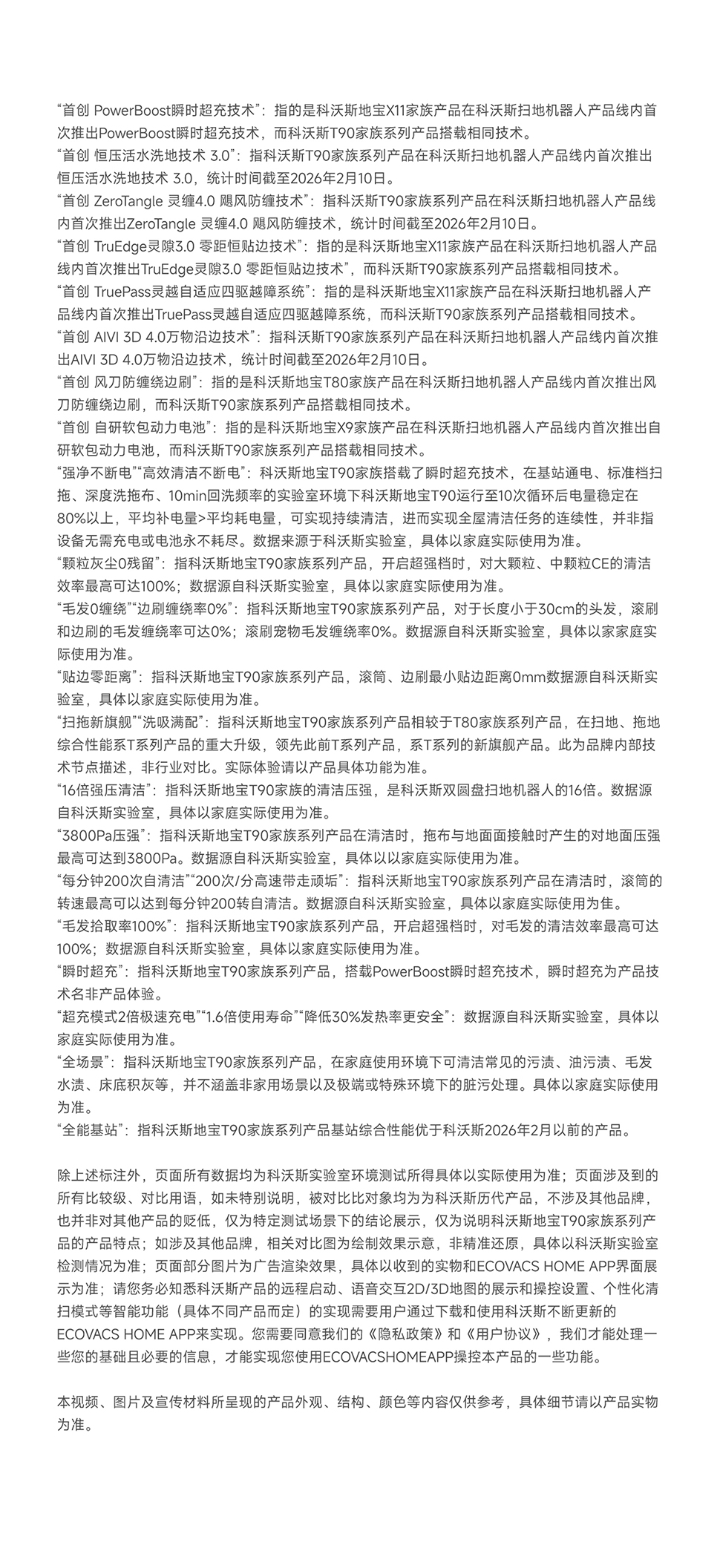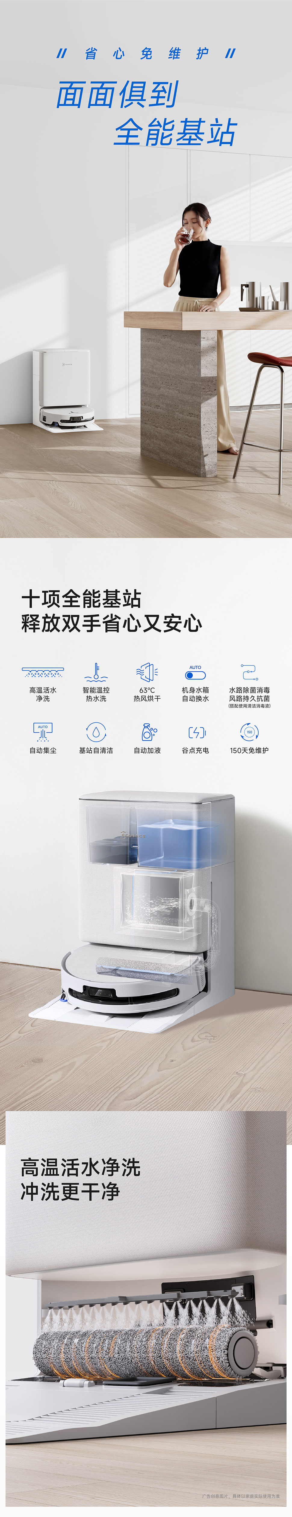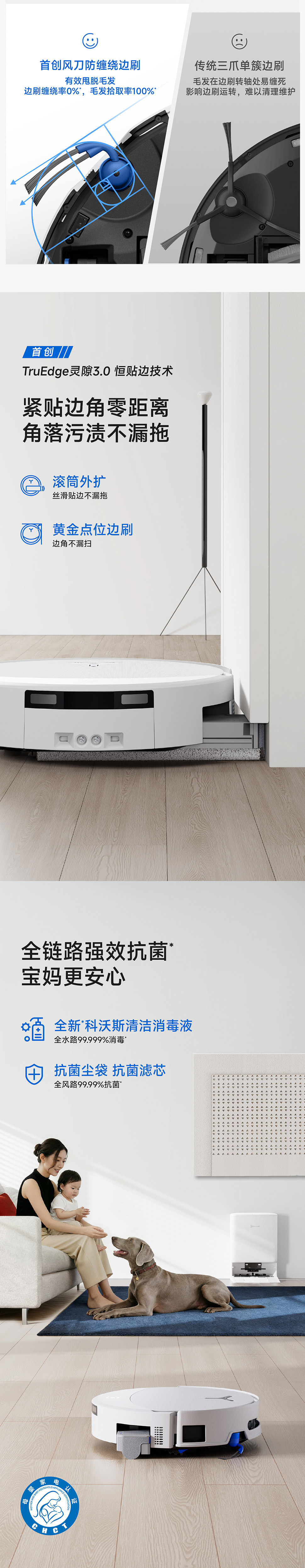 | 包装清单 | 主机*1、基站*1、电源线*1、说明书*1、快速指南*1、边刷*1、毛胶滚刷&滚刷盖板(个)*1、抗菌滤芯*1、抗菌集尘袋*1、清洁消毒剂(260ml/瓶)*1、普通超纤滚筒*1,清水箱(个)*1、污水箱(个)*1 |