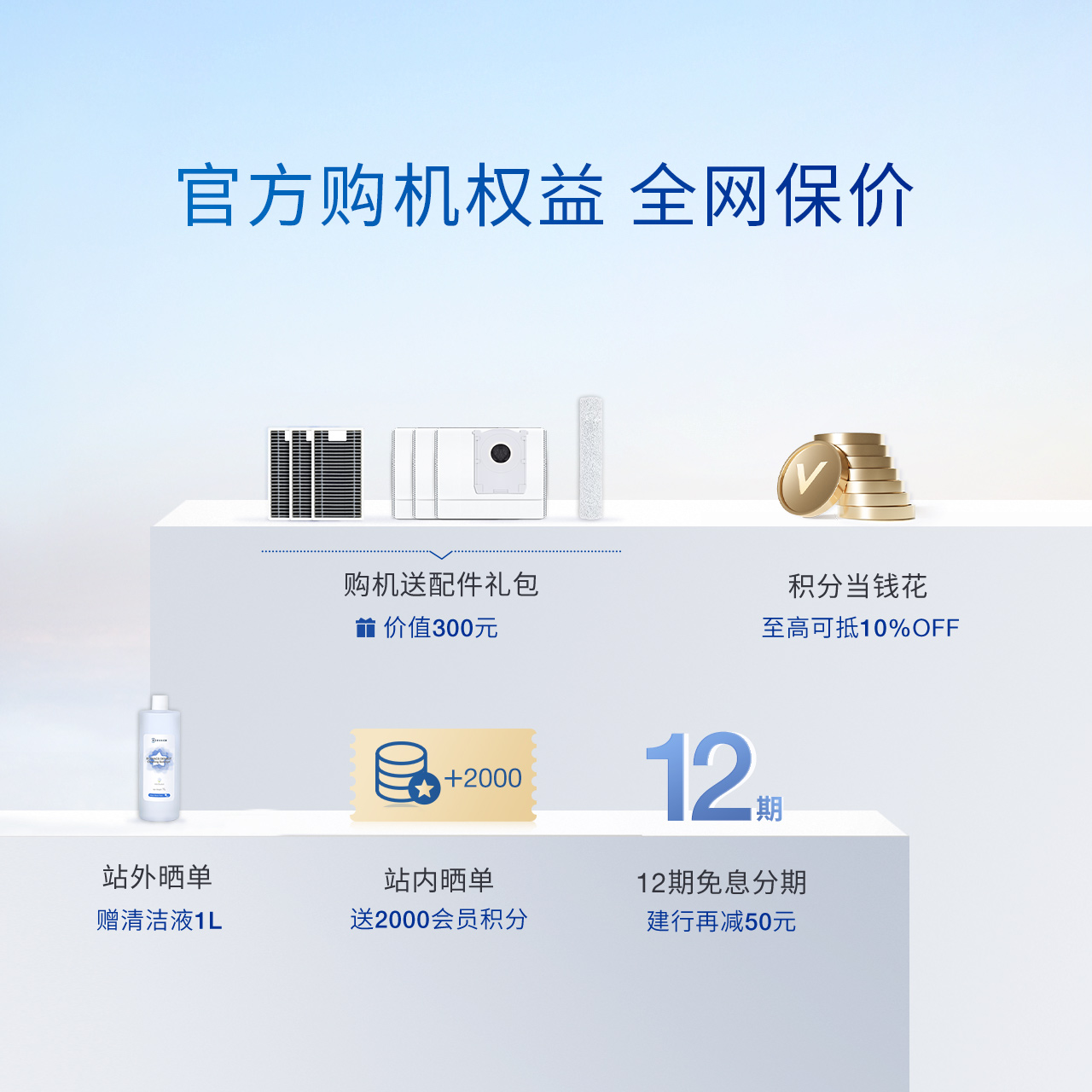| 包装清单 | 主机*1、基站*1、电源线*1、说明书*1、快速指南*1、边刷*1、毛胶滚刷&滚刷盖板(个)*1、抗菌滤芯*1、抗菌集尘袋*1、清洁消毒剂(260ml/瓶)*1、普通超纤滚筒*1,清水箱(个)*1、污水箱(个)*1 |