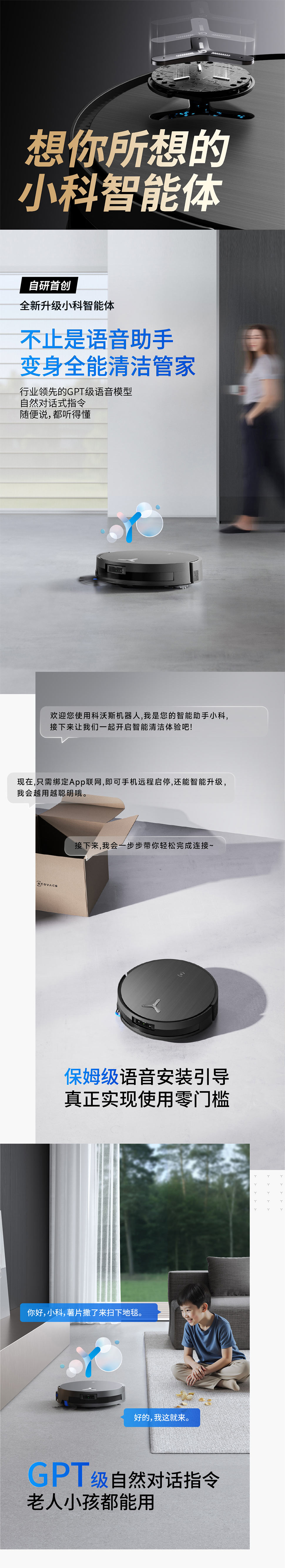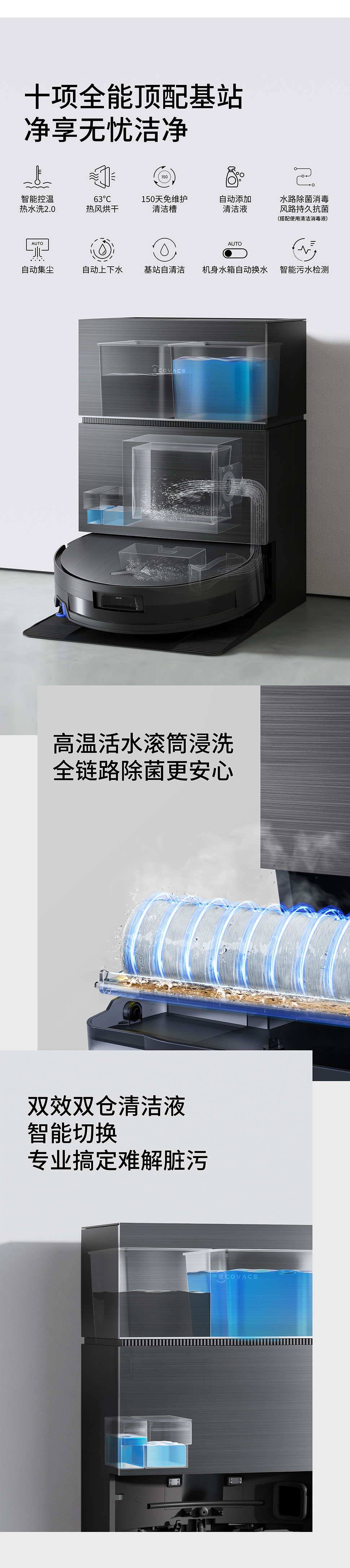 包装清单 | 主机*1、基站*1、电源线*1、说明书*1、快速指南*1、边刷(个)*1、毛胶滚刷&滚刷盖板(个)*1、抗菌滤芯(个)*1、抗菌尘袋(个)*1、清洁消毒剂(260ml/瓶)*1、重污清洁液(260ml/瓶)*1、辅仓自动加液模块(个)*1、普通尼龙滚筒(个)*1、清水箱(个)*1、污水箱(个)*1 |