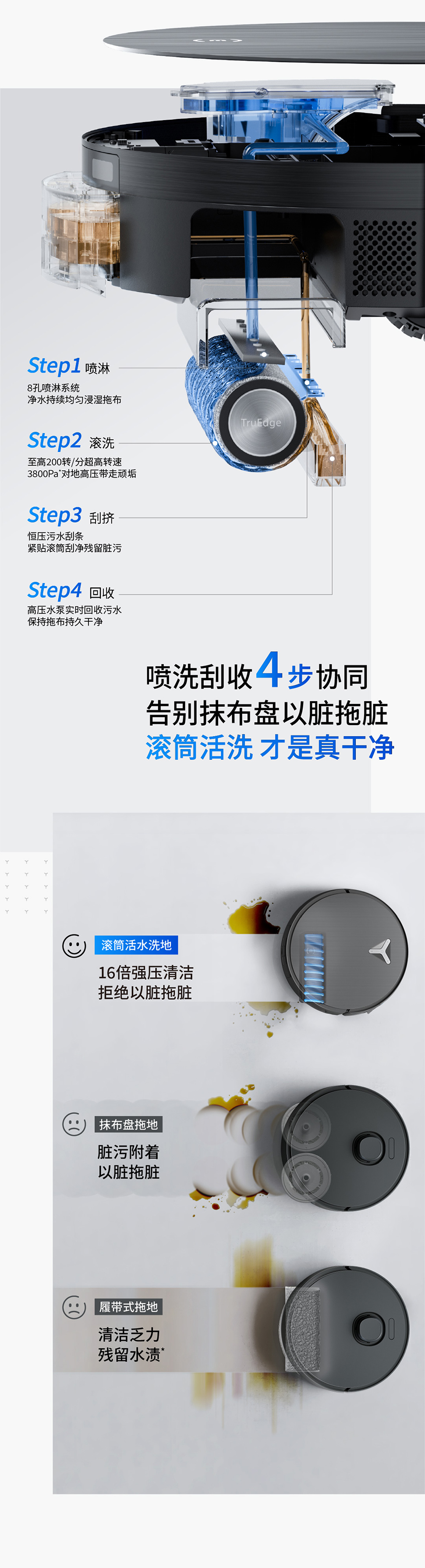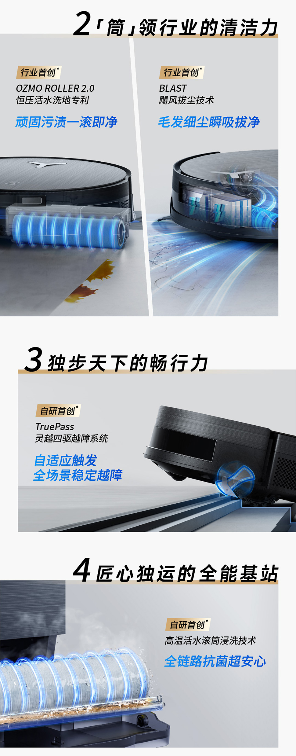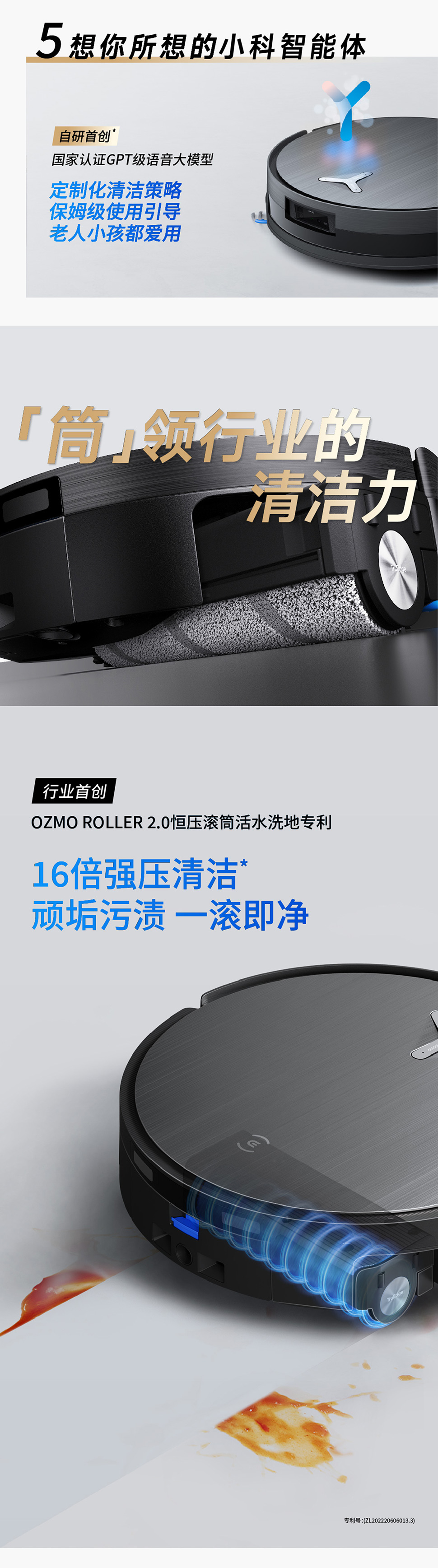 包装清单 | 主机*1、基站*1、电源线*1、说明书*1、快速指南*1、边刷(个)*1、毛胶滚刷&滚刷盖板(个)*1、抗菌滤芯(个)*1、抗菌尘袋(个)*1、清洁消毒剂(260ml/瓶)*1、重污清洁液(260ml/瓶)*1、辅仓自动加液模块(个)*1、普通尼龙滚筒(个)*1、清水箱(个)*1、污水箱(个)*1 |
