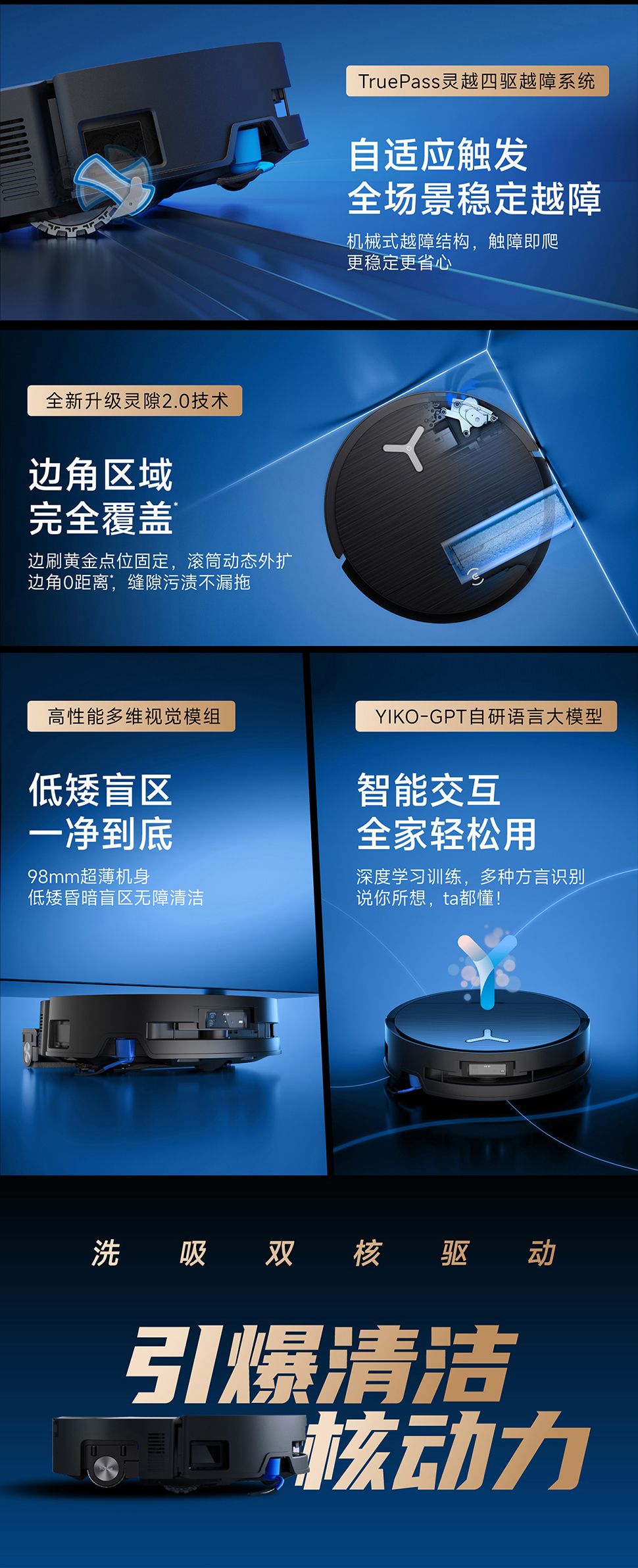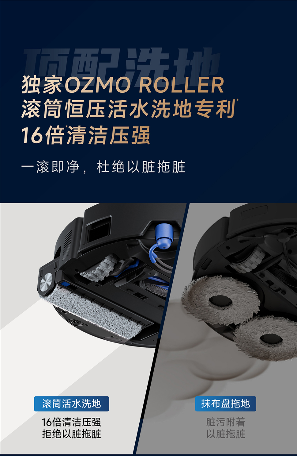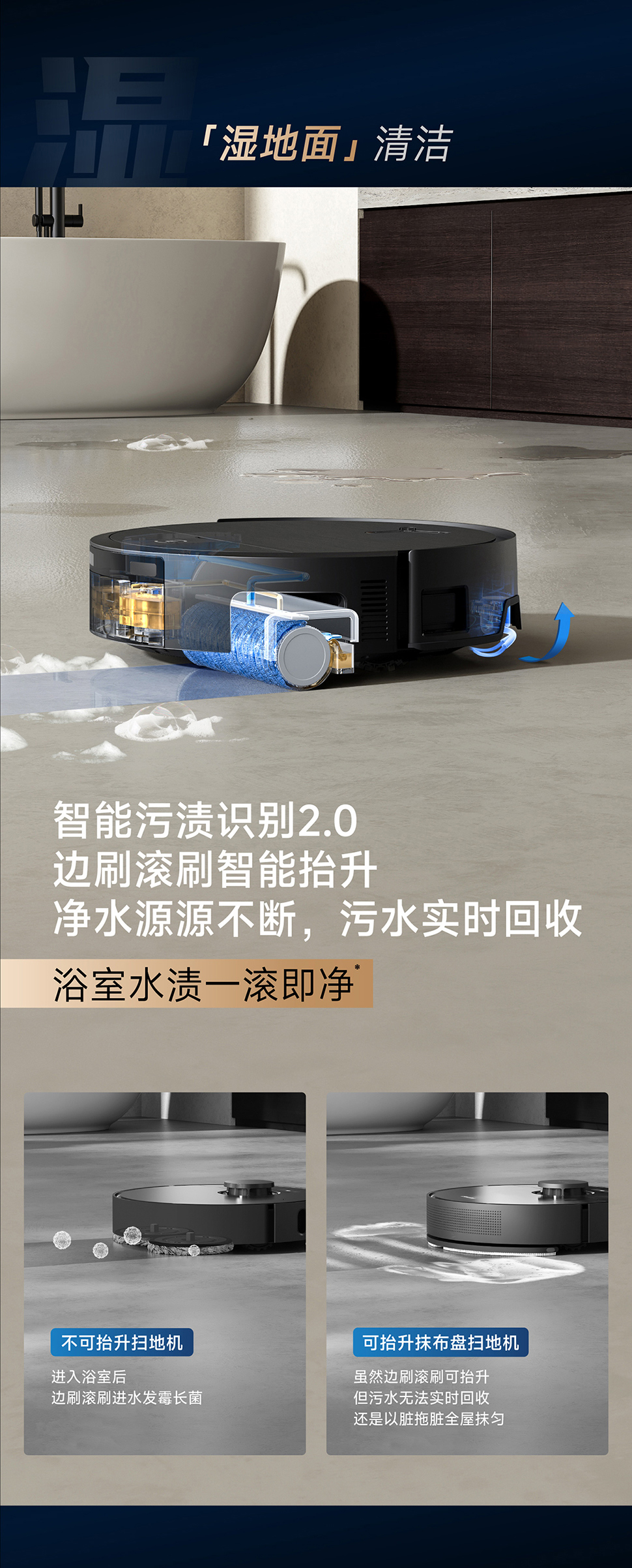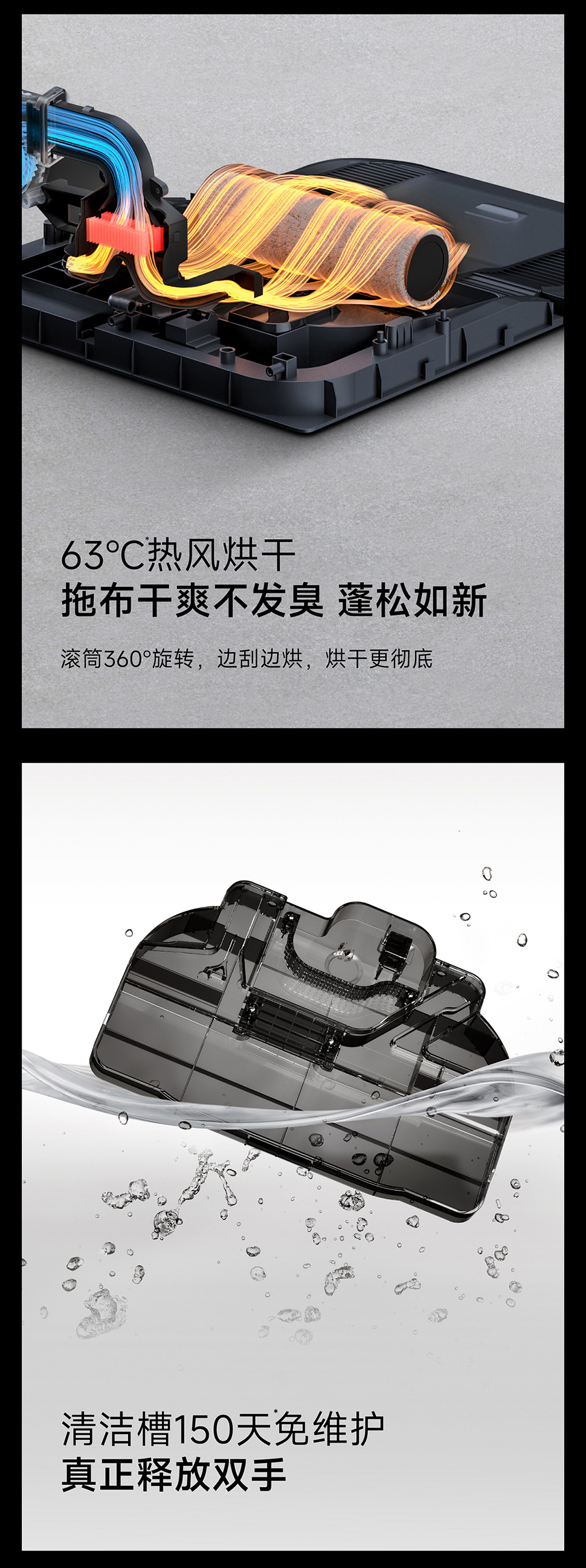 | 包装清单 | 主机*1、基站*1、电源线*1、说明书*1、快速指南*1、边刷*1、毛胶滚刷&滚刷盖板(个)*1、抗菌滤芯*1、抗菌集尘袋*1、清洁消毒剂(260ml/瓶)*1,普通滚筒(灰色)*1,上下水模块(含配件)*1 |